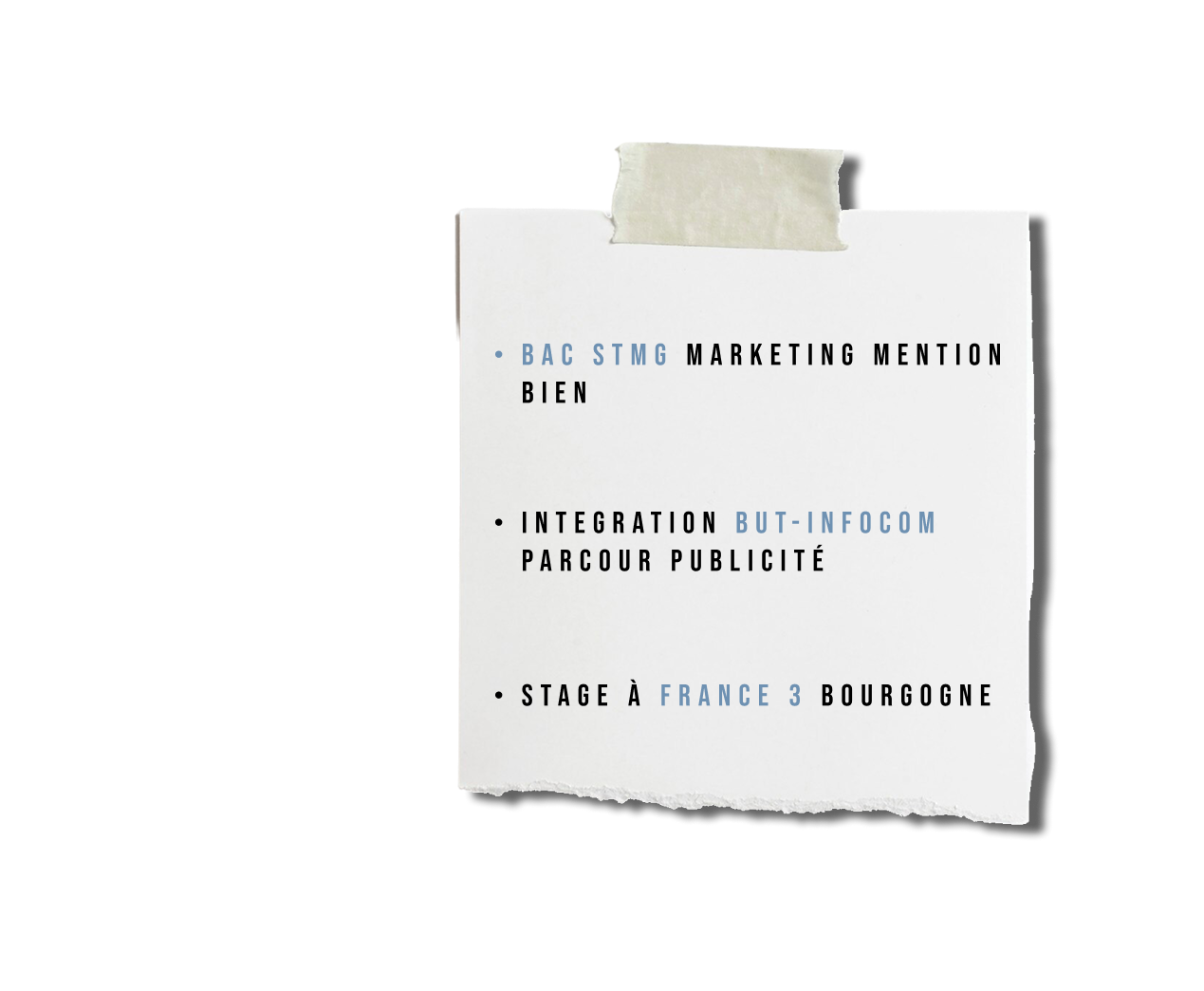 Après un bac STMG avec une première approche du marketing, j’ai choisi le BUT Info-Com, parcours Publicité à Besançon. Ce choix me permet d’allier ma passion pour la créativité et mon envie de construire une carrière dans la communication. J’ai aussi eu la chance de faire un stage d’un mois à France 3 Bourgogne, une expérience très enrichissante qui m’a ouvert les portes du monde professionnel.
